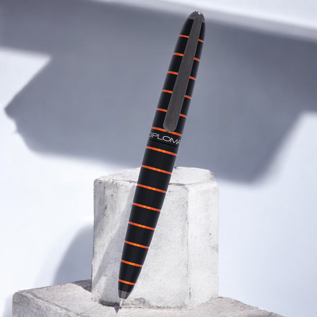 Diplomat Elox Black/Orange Ballpoint Pen is a high-quality writing instrument manufactured by Diplomat, a German brand known for its fine writing tools. The future is the cutting edge design of the Diplomat Elox. Elox derives for the "eloxieren" which means "anodize" in German and was chosen to recognize the complexity of the double anodizing process, a unique and innovative technology being applied by Diplomat for the first time. Inspired by bestselling Aero collection, Elox features full black anodized aluminium body, complimented by horizontal anodized orange rings.