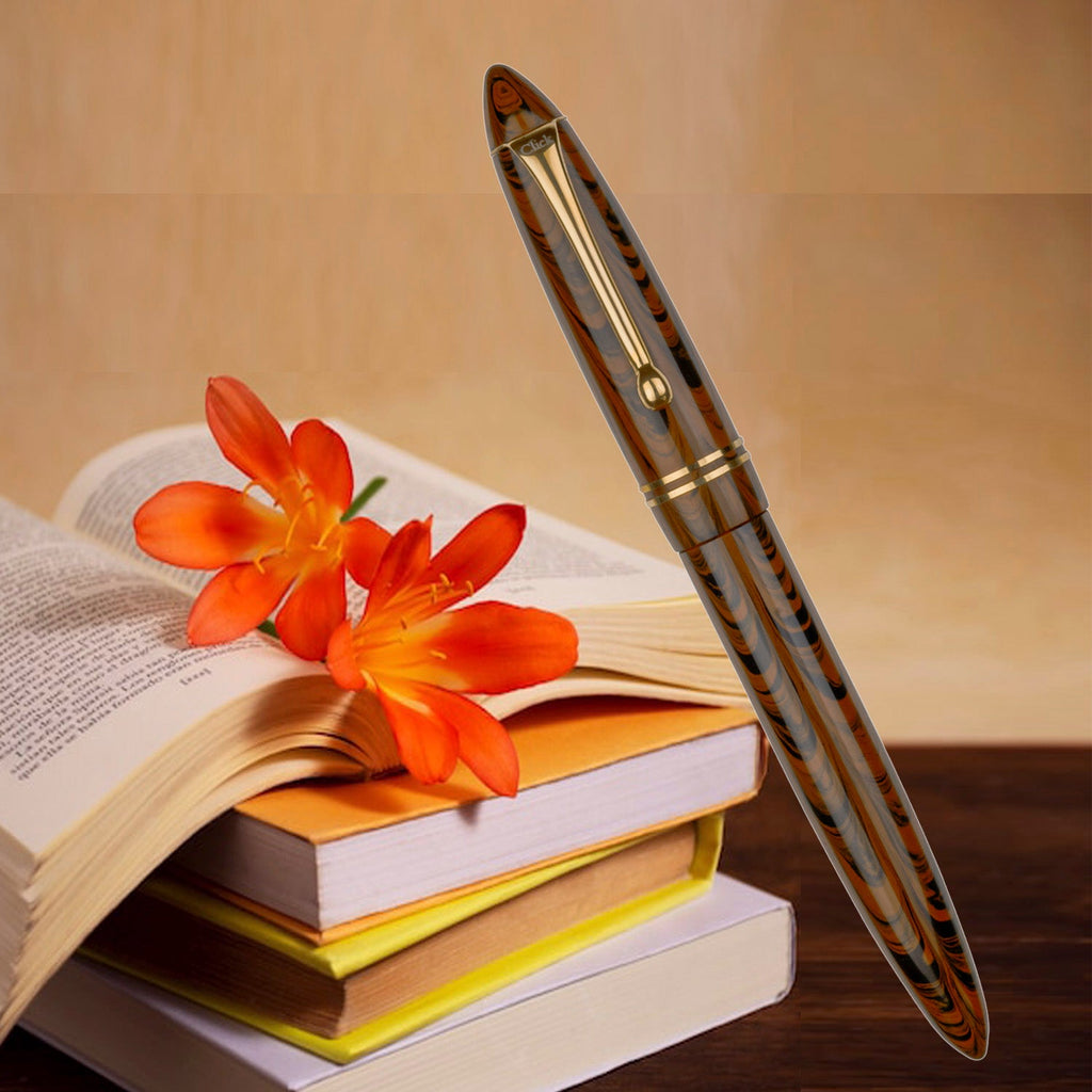 The Click Yen Ebonite Brown Black GT Fountain Pen is one of the oldest pen brands in India. They make good quality hand made ebonite pens and Plastic pens. The Click Yen has a Unique and vintage Desing. The Ebonite Brown Black Fountain Pen is completely handcrafted High-quality ebonite body with Gold plated trims and nib. All Click Pens have classic designs with a modern twist. Pen comes fitted with converter & 2 long blue cartridges are also supplied with pen. Pen is designed with a unique 3in1 ink filling mechanism. All Click Pens have classic designs with a modern twist. Pen can be used as a eyedropper pen (u can fill ink directly into barrel) or u can use converter with pen or u can also use cartridge with the pen, that is really a very unique thing of this pen. Smooth writing high quality German Made JoWo Nib.