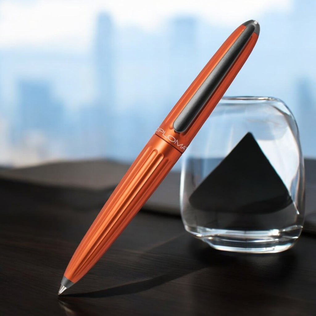 The Diplomat Aero sports one of the most unique designs out there right now. In 1900 the Zeppelin airship began its first test flight under the aeronautical leadership of Earl von Zeppelin. Based on this event and the design of the airship Diplomat introduces the Aero pen to the market. Aero is characterized by groove-like depressions on the barrel and cap which lends the pen next to its classic form a modern spirit. Aero is made of anodized aluminum and is especially designed ergonomically. The clip harmonises well with the shape of the pen. The Diplomat Aero is available in Fountain Pen, Roller Ball Pen, Ballpoint Pen and Mechanical Pencil Diplomat Aero Mechanical Pencil Orange comes packed in a nice Diplomat Gift Box. Diplomat Aero series covers the major writing instruments from Fountain Pen, Roller Ball Pen, Ballpoint Pen to Mechanical Pencil.