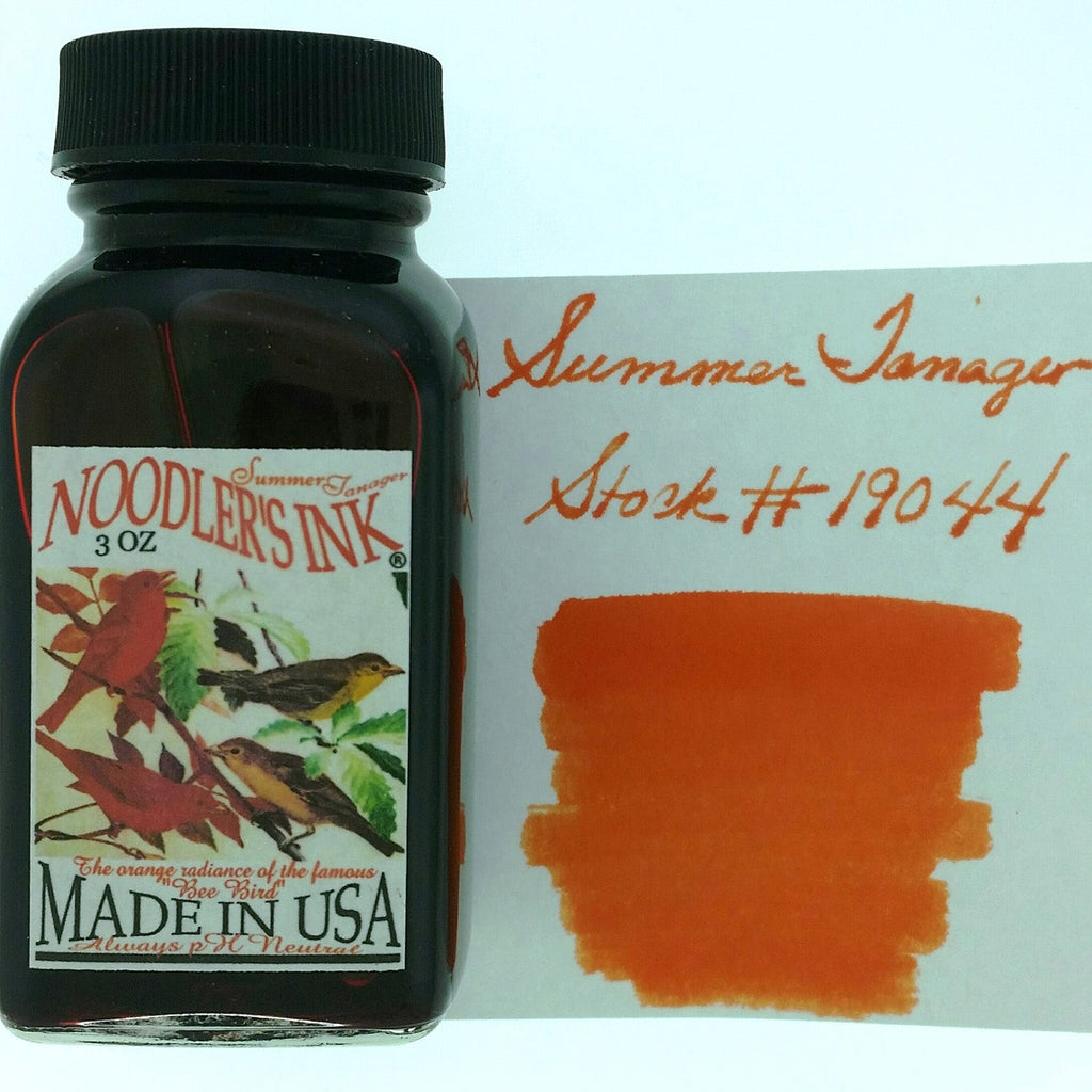 Noodler's Ink Bottle Summer Tanager 3Oz is packaged in a glass bottle and is approximately 88 ML. The ink is sold in industry-standard glass bottles and 100% made in the USA from cap to glass to ink.