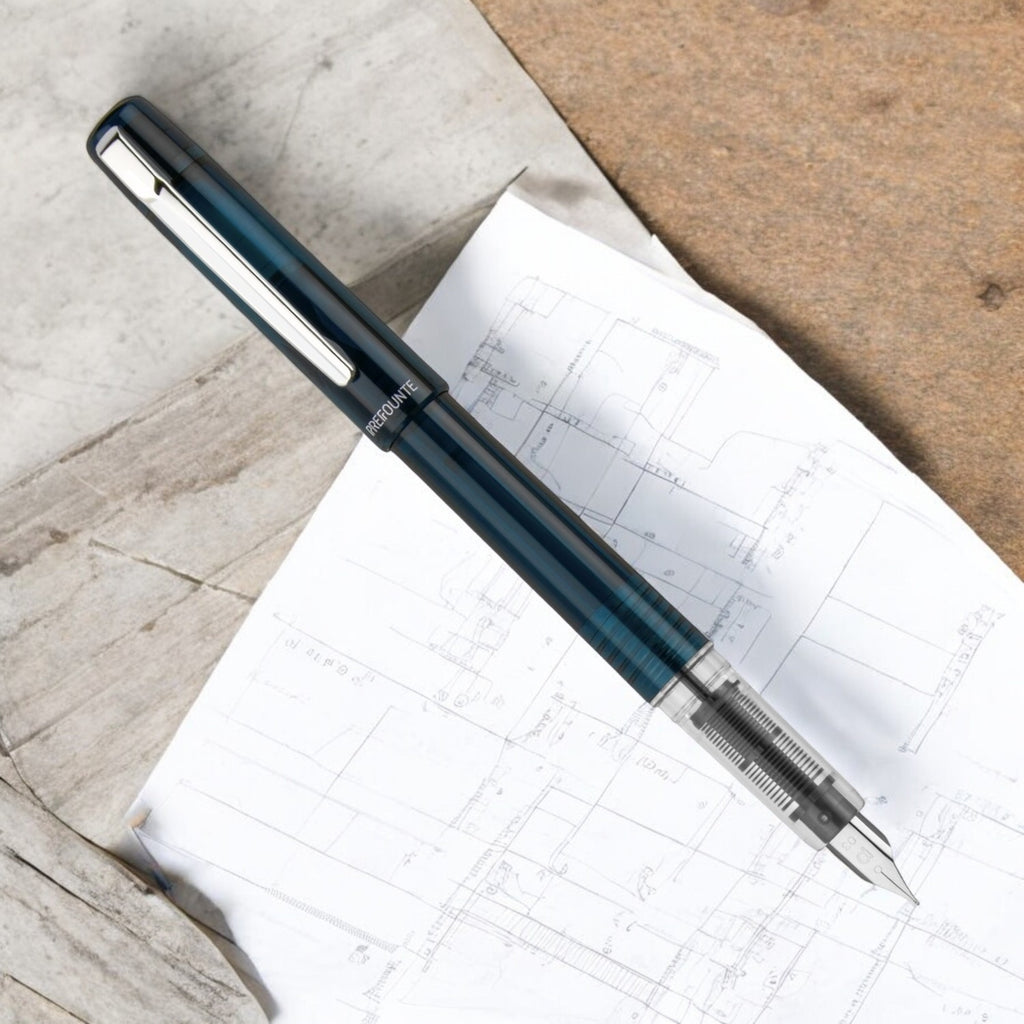 The Platinum Prefounte fountain pens come with a transparent resin body in subdued colors and a chrome plated spring steel clip. Desinged with a clear section to see the ink, an ABS feeder and a stainless steel nib. The cap contains a "Slip & Seal" mechanism to prevent ink from drying out in the pen with the cap on for a year. The Platinum Prefounte fountain pens are ideal for those who seek a smart and casual fountain pen and perfect for beginners. Platinum Prefounte Fountain Pen Night Sea is fitted with our precision Stainless Steel Nib. The package is blister packed with the pen, 1 cartridge and does not includes a converter.