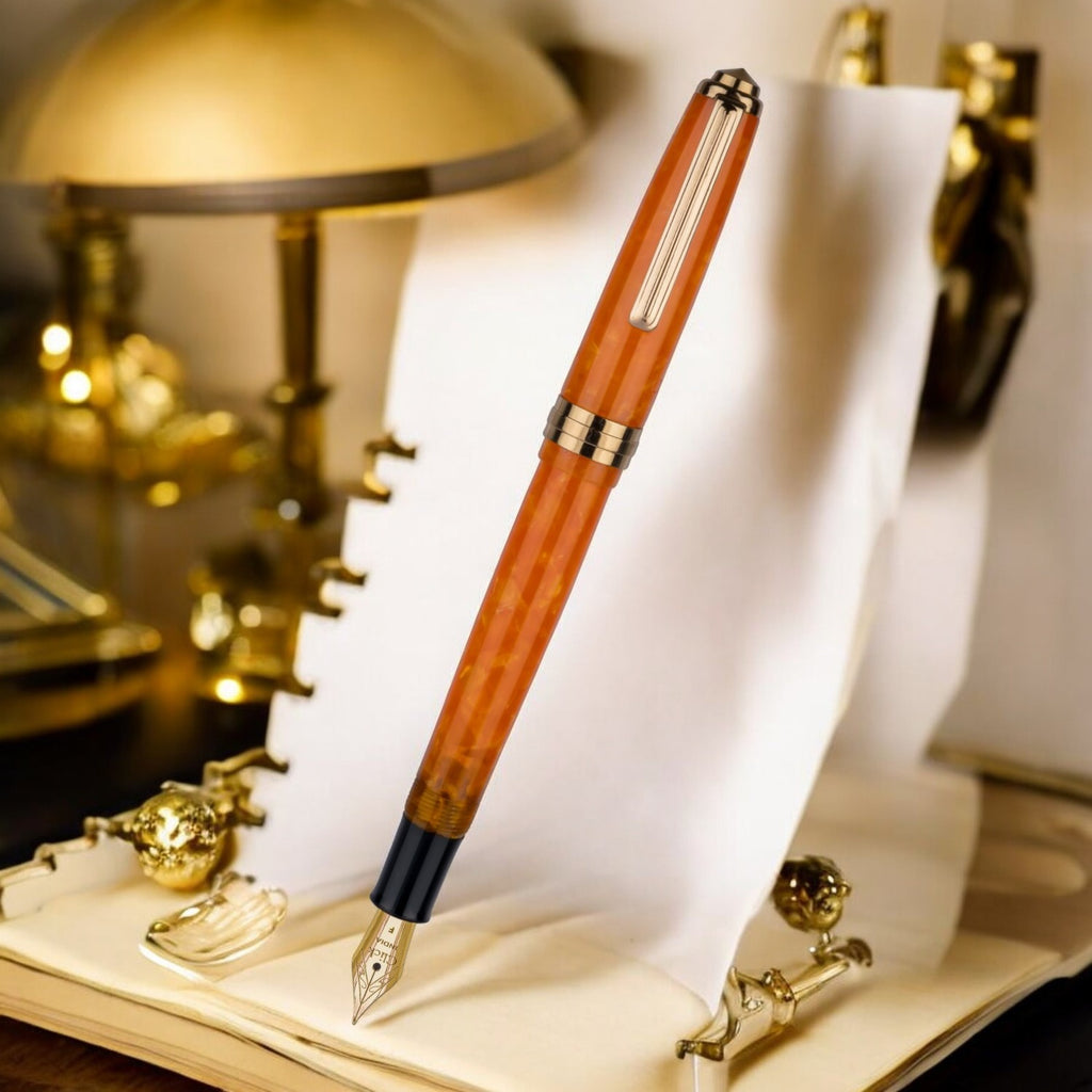 The Click Falcon Acrylic Sunburst Orange GT Fountain Pen is a one of the oldest pen brands in India. CLICK are Indian manufactures of quality Fountain Pens. Beautiful Orange marbled with golden trims gives a very rich look to pen. Fountain Pen can used 3 in 1 filling system as cartridge, converter and eyedropper, this is a very unique feature of this pen , giving it a huge capacity of ink while long writing. Fountain Pen comes with 1 converter & 2 cartridges, Packed in a velvet pouch.