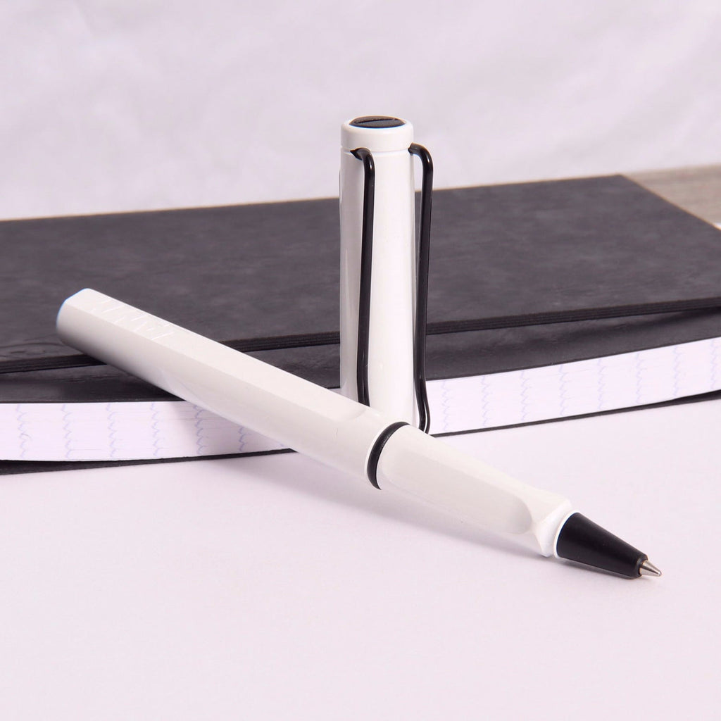 The Lamy Safari White/Black Roller Ball Pen is a Special Edition 2022. The LAMY Safari range incorporates functional modern design with a lightweight, durable plastic to create a reliable, robust, classic Roller Ball Pen suitable for beginners and experts alike. Initially designed for students, the LAMY safari rapidly became a staple for Roller Ball Pen lovers of all ages. With a click-cap mechanism for effortless usability and distinctive recessed grip to ensure comfort for long note-taking sessions, the Safari is the perfect companion for the everyday writer. Clipping is a breeze with a characteristic wide metal clip that won't catch on fabrics. Available in a range of classic and vibrant colours to start your collection, with special edition colours are released each year. Roller Ball Pen comes with LAMY M 63 M black refill.