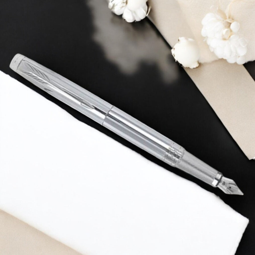 The Parker Aster Shiny Chrome CT Fountain Pen is a timeless writing instrument that combines classic design with modern functionality. Parker Aster Pen is contemporary & unique design body. Blended & highlighted with Classy style suites to your personality. The Parker Fountain Pen features a slim and elegant profile that rests comfortably in the hand. The pen's Shiny Chrome Finish Metal body showcases a timeless aesthetic, making it a symbol of refined taste and sophistication. The stainless steel nib of the Pen is a testament to Parker's commitment to providing a superior writing experience. The nib glides smoothly across paper, allowing for precise control and an expressive writing style. Whether used for signatures, letters, or creative writing. The pen's cartridge-converter system allows for easy ink refills, providing convenience and flexibility for various ink options. Ideal for personal use or as a thoughtful gift, the Parker Aster Fountain Pen is presented in a stylish gift box, making it a statement piece for those who appreciate quality and style in their writing instruments.