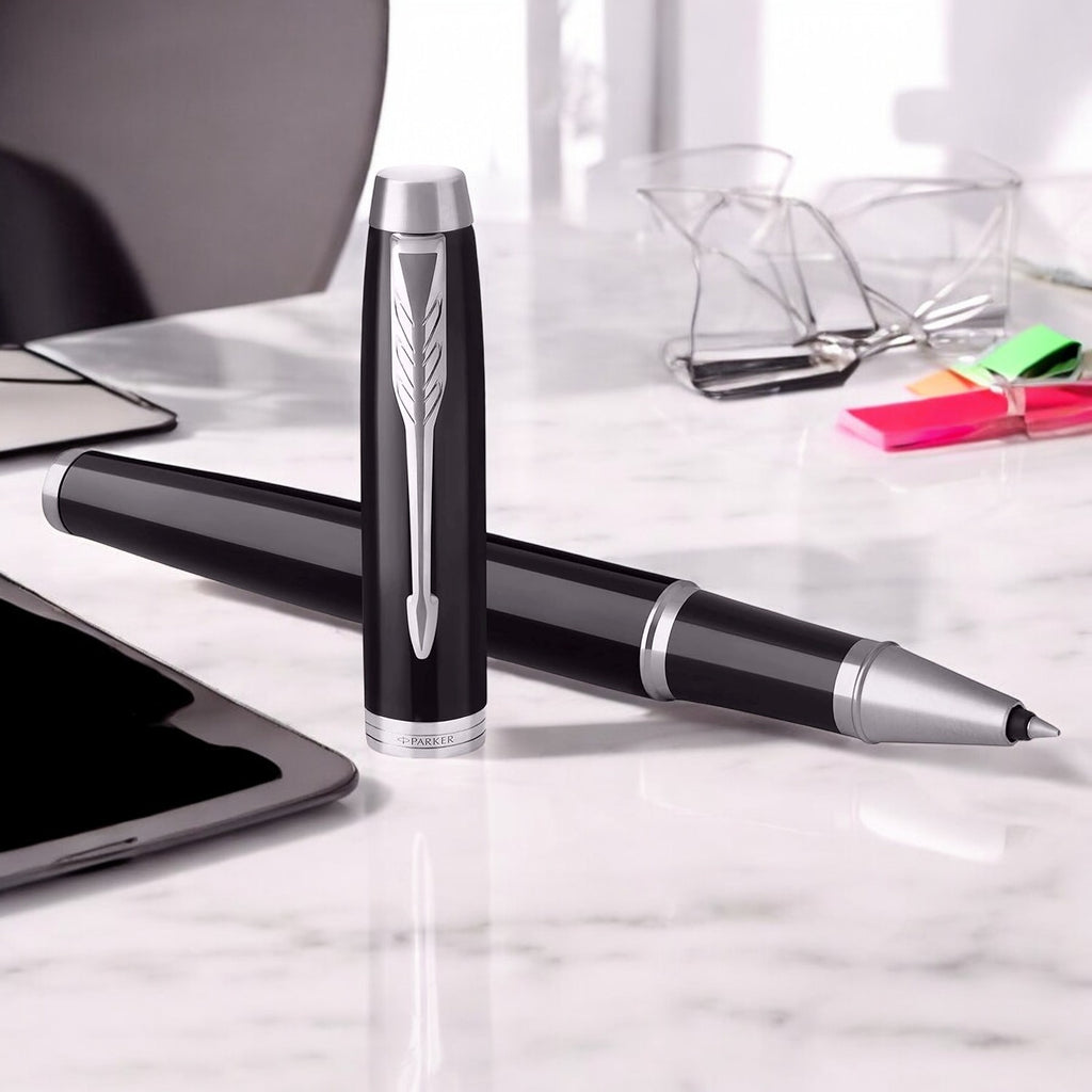 The Parker IM Metal Black CT Roller Ball Pen is part of the Parker IM Premium collection. The IM Metal Black CT Roller Ball Pen is made of brass and has the cap and off mechanism. The Parker IM Metal Black CT Roller Ball Pen Glossy black lacquer complemented with chrome finish trims. The blue german ink is smudge proof and blot free, thus leaving you with a neat page. The stainless tip has fine tip grade that offer you with a flawless writing experience when you start writing. The Tungsten Carbide Ball of the pen ensures that every word you write is comfortably written. The IM Roller Ball Pen is presented in a stylish gift box. Parker IM Roller Ball Pen is ideal as a gift for everyone on all kinds of occasions like birthdays or as a Christmas gift. This Rollerball Pen comes with one rollerball refill in random colour blue or black.