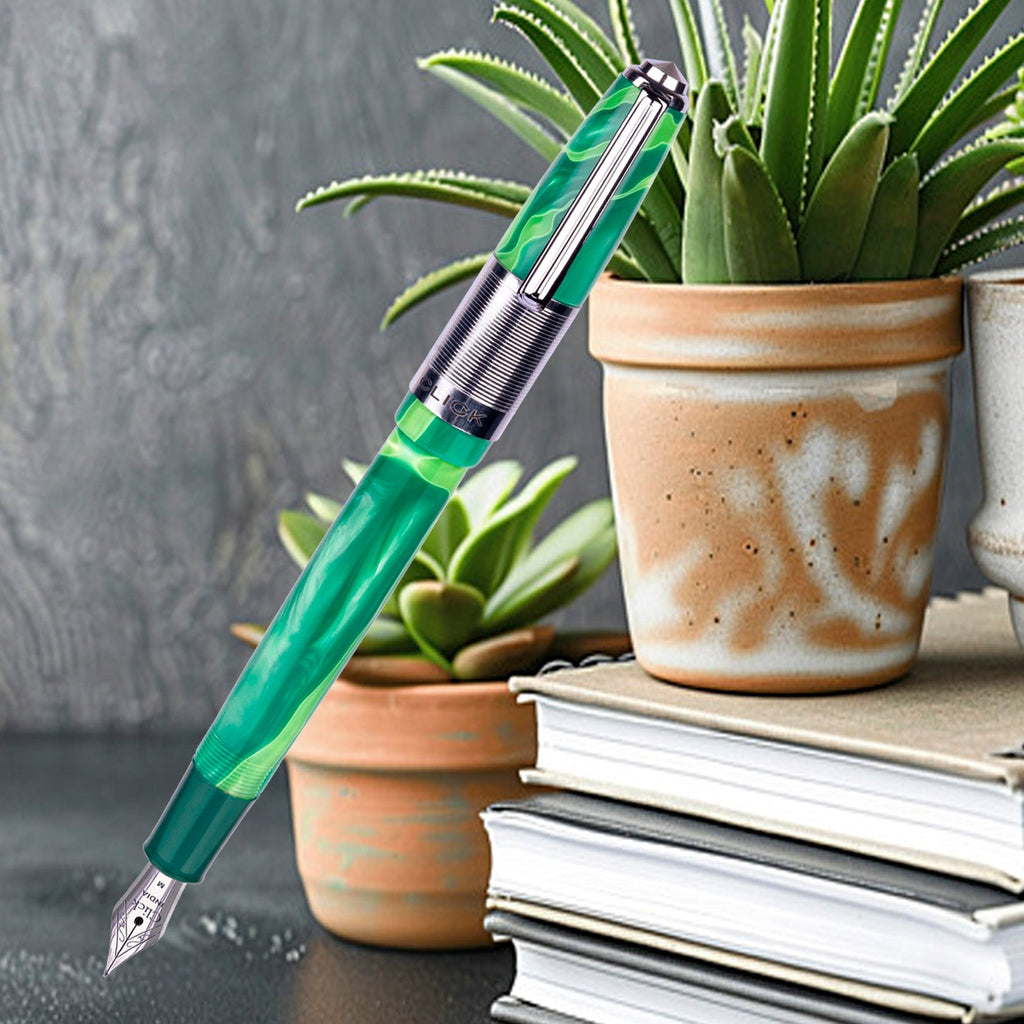 The Click Retro Green CT Fountain Pen is a new model from the brand Click. CLICK are Indian manufactures of quality Fountain Pens. The Click Retro Fountain Pen draws inspiration from the legendary designs of yesteryears, blending classic aesthetics with contemporary functionality. Beautiful made from dark green and light green marbled texture on body with Chrome trims gives a very rich look to pen. Fountain Pen can used 3 in 1 filling system as cartridge, converter and eyedropper, this is a very unique feature of this pen, giving it a huge capacity of ink while long writing. Fountain Pen comes with 1 converter & 2 cartridges, Packed in a click gift box.