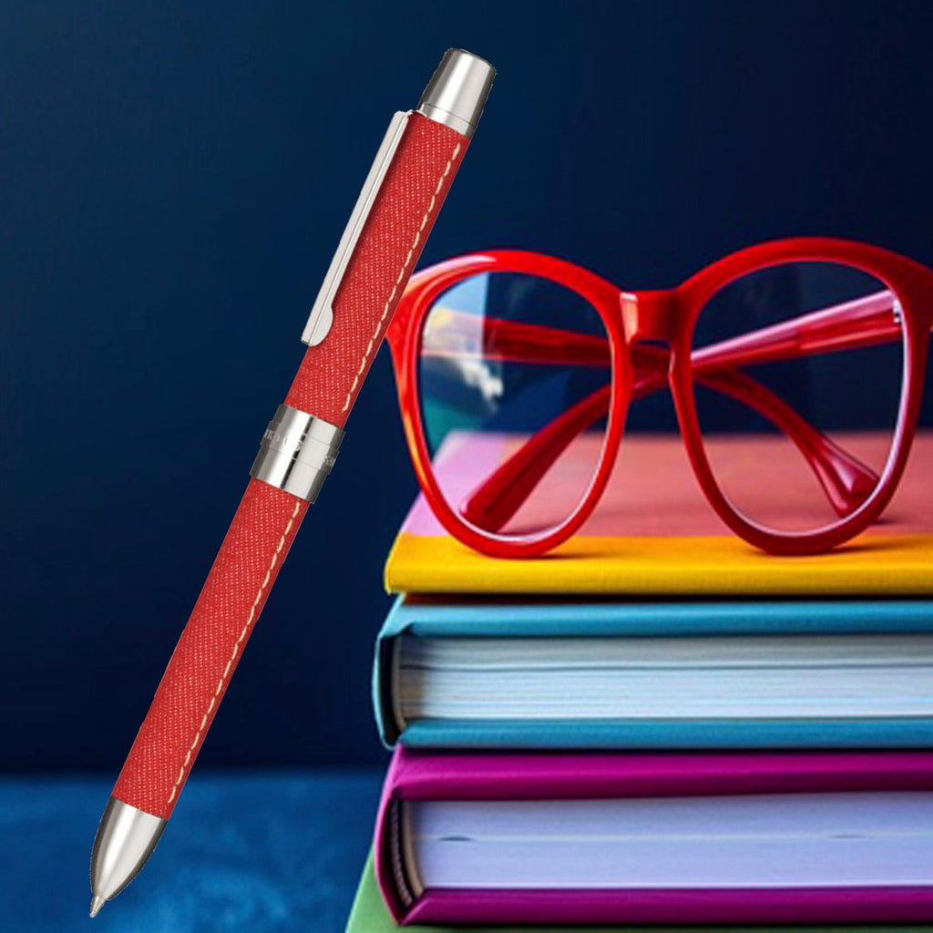 The Sailor Refino D is a Denim Fabric Wrapped multi-function writing instrument, Multi-Purpose Writing Instrument This multi-functional writing instrument combines a black and red ballpoint pen with a mechanical pencil in one body. The cover and body are made of denim fabric. To enhance the decorativeness, color stitching that matches each color is applied. The slim barrel diameter makes it suitable for use by both men and women.