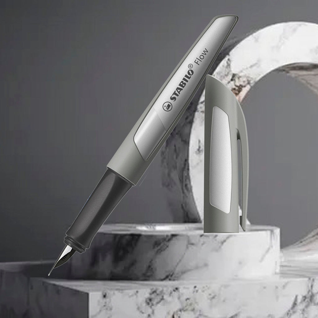 The STABILO Flow fountain pen impresses with its modern, simple design and neat typeface. The monochromatic color scheme is classy and simple so that it fits into any pen collection. Thanks to the ergonomic grip zone, it sits securely in your hand when writing. The high-quality M nib with iridium grain glides over the paper without blotching or scratching. The spring-loaded cap also prevents the ink from leaking out. The STABILO Flow is refilled with standard cartridges.