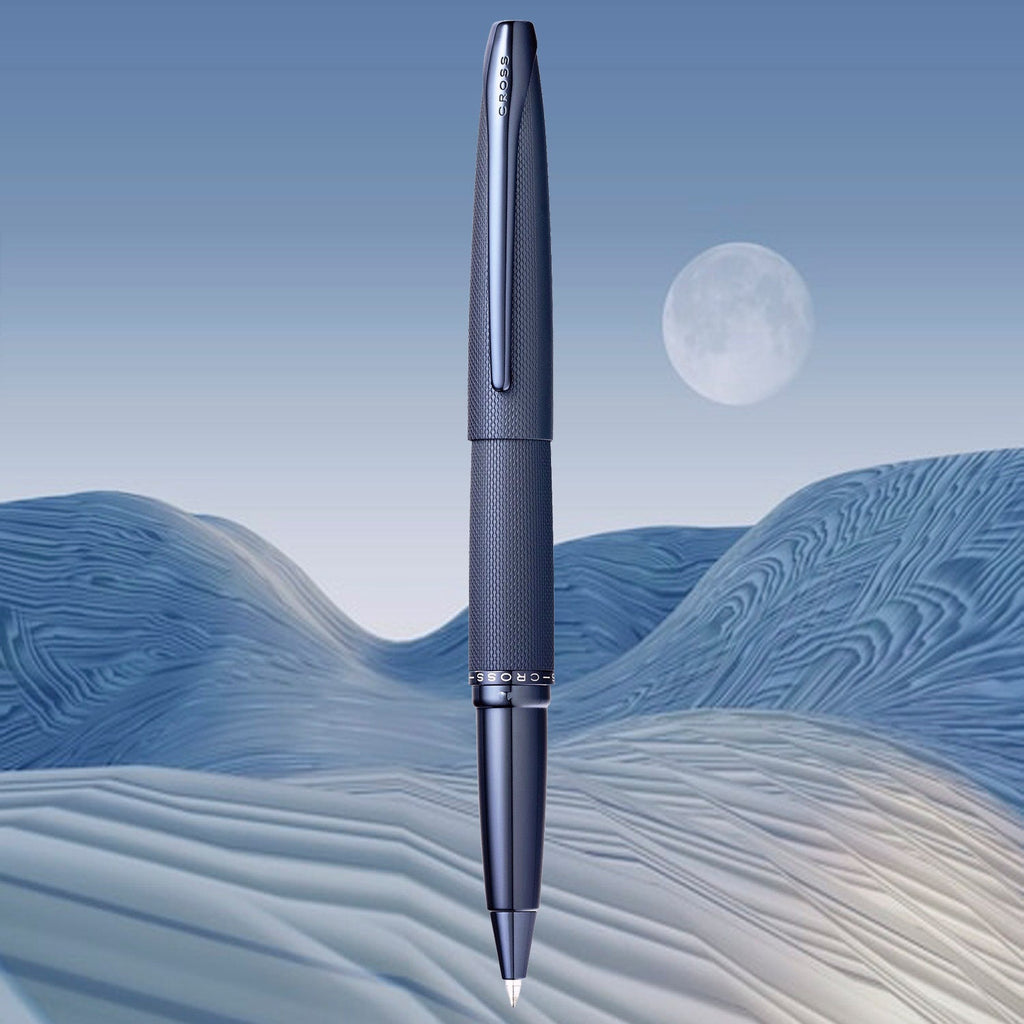The Cross ATX Sandblasted Dark Blue Roller Ball Pen is a stylish and modern writing instrument from Cross's ATX collection. Cross ATX Roller Ball Pen is sleek silhouette creates a uniquely modern and an ergonomic writing experience. It features a Sandblasted Dark Blue finish with a machine-turned, diamond-pattern engraving and polished blue PVD appointments. Includes 1 Black Gel Ink Rollerball Refill (#8523) in pen Cross Rollerball pens can easily be converted into a ballpoint pen, document highlighter or creamy porous felt-tip pen by simply changing the refill to desired type of tip. Streamlined from integrated clip to tapered tip, ATX delivers singular contemporary style in a chic, ergonomic package. A delicate balance of design ingenuity and practical sensibility that's often imitated, never duplicated. The Cross ATX series is known for its contemporary style, and this pen is a great option for both personal and professional use.