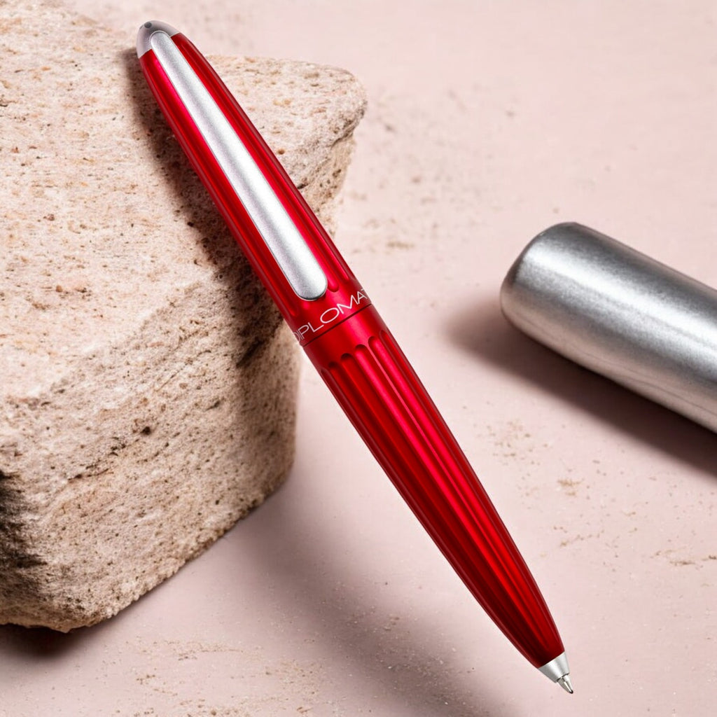 The Diplomat Aero Red easyFlow Ball Pen is a high-quality writing instrument manufactured by Diplomat, a German brand known for its fine writing tools. In 1900 the Zeppelin airship began its first test flight under the aeronautical leadership of Earl von Zeppelin. Based on this event and the design of the airship Diplomat introduces the Aero pen to the market. The Diplomat Aero is characterized by groove-like depressions on the barrel which lends the pen next to its classic form a modern spirit. The Diplomat Aero is made of anodized aluminum and is especially designed ergonomically. The clip harmonises well with the shape of the Diplomat Aero. The AERO is available in a wide variety of metallic shades. In this way, the AERO can express every personality - a high-quality gift for every occasion. All Aero pens are presented in a luxury aluminium gift box.
