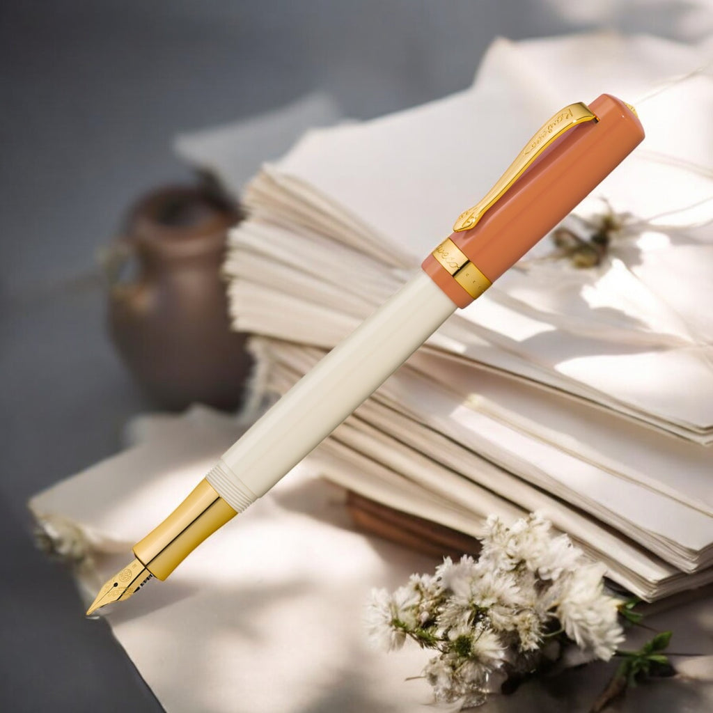 The classic Kaweco Student fountain pen is made of high-quality acrylic with metal parts and chrome details. The Kaweco Student Fountain pen has a steel nib made by the German company Bock Heidelberg and fills by cartridge or converter. Kaweco belongs to one of the oldest brands on the market. For more than 125 years Kaweco pens are an integral part of High-Class assortments. Kaweco insistently focuses on the thin line between tradition and innovation and therewith since 1883 secur. Nothing unstylish about this pen though, with its ivory barrel, dark orange cap and gold-coloured trim. Gold-plated stainless-steel nib, available with medium, fine, extra-fine, broad or BB tip. Screw-on cap.