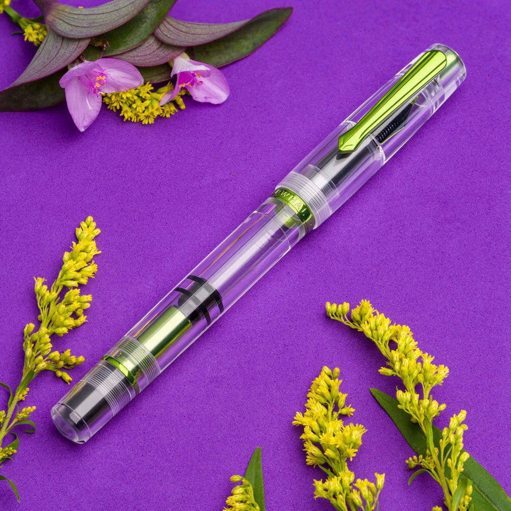 The Nahvalur Original Spring Fountain Pen offers a captivating view of its piston-filling mechanism in action, allowing the writer to witness the graceful movement and the ink swirling within the crystal-clear barrel reservoir. Enhanced by a transparent resin body, this pen exudes elegance, complemented by an art deco green PVD clip and an engraved barrel band. Experience a heightened level of refined sophistication as the piston effortlessly glides, creating a mesmerizing display of ink dynamics within the reservoir. The Original Spring is a visual ode to the season that echos the fresh hues of springtime. The green color-plated trim adds a touch of sophistication, making the Original Spring a statement piece for the season of rejuvenation. True to the Nahvalur tradition, the Original Spring comes with green color stainless steel nibs, available in fine, medium, broad, and stub sizes. Known for their smoothness, these nibs promise a writing experience that's as flawless as the flow of a serene spring brook.