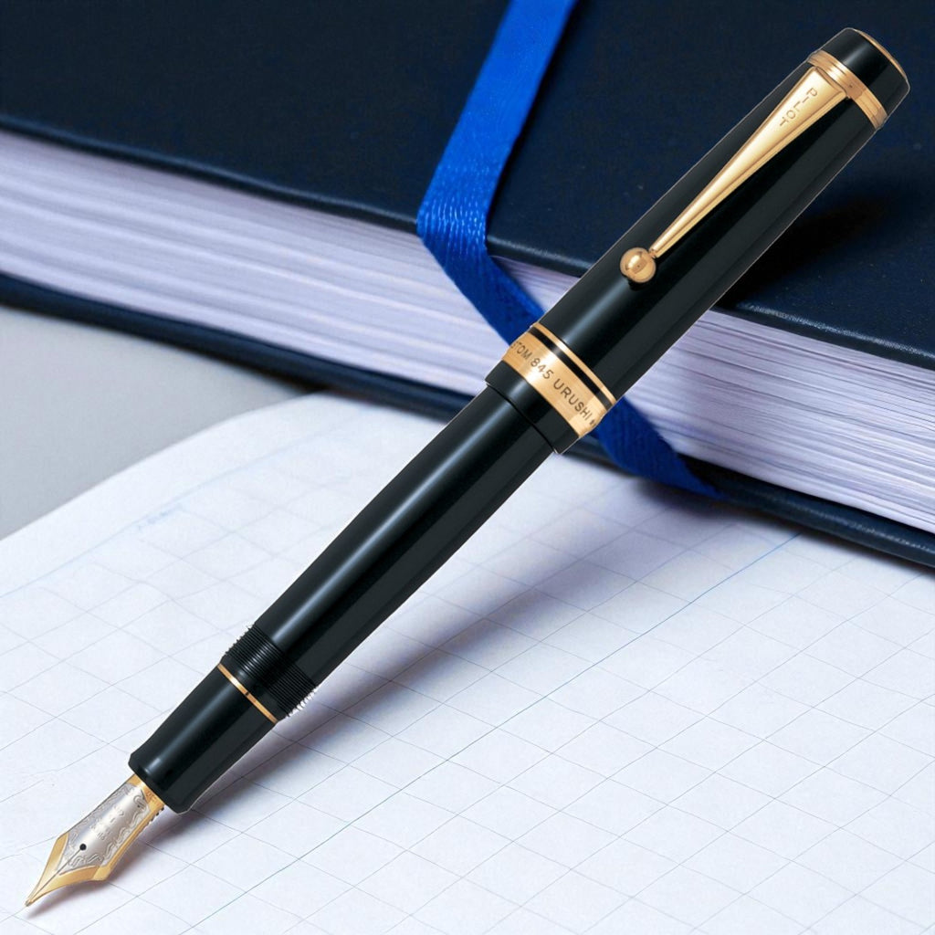 The Custom 845 is the newest series to launch in the Custom line of fountain pens. The Pilot Custom 845 Black is the smaller version of the Pilot Custom Urushi fountain pen. The Custom 845 is extremely popular worldwide because of its unique Urushi lacquer finish, two-toned 18k gold nib (size #15) and large barrel size. A Pilot Con-70 converter is included, but you can also use proprietary Pilot ink cartridges if you prefer. This exceptional Custom fountain pen is packaged in an elegant gift box. Urushi lacquer comes from the sap of the Asian lacquer tree. When applied to the pen barrel, it hardens and absorbs moisture from the air, resulting in a shiny coat. Creating an Urushi lacquer fountain pen is an exacting and complex process because the lacquer must be carefully applied to the pen barrel in numerous hand painted layers. This traditional Japanese technique ultimately enhances both the pens’ beauty and longevity.
