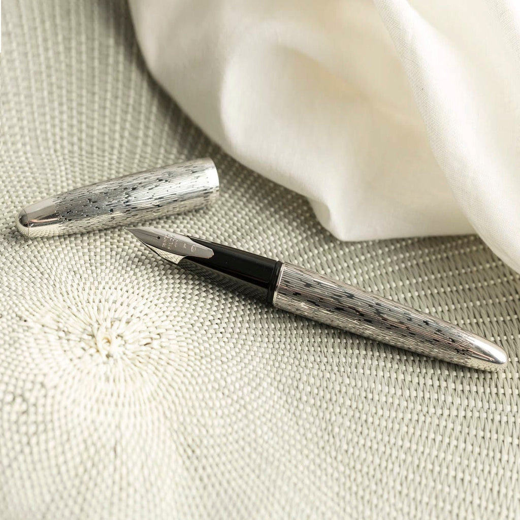 The Pilot Sterling Silver Tsumugi CT Fountain Pen is a handcrafted from genuine sterling silver. Each pen is engraved with an exquisite detailed design, a symbol chosen by Pilot to reflect an important facet of Japanese culture. “Tsumugi” has a pattern that is based on a piece of silk fabric. This fountain pen features a rhodium-plated 18k gold inlaid nib. A CON-40 converter is included with each pen, but they will also accept Pilot proprietary ink cartridges. The snap cap secures the pen when not in use and although it’s a bit heavy, it will post to make a nicely balanced pen when writing. The overall weight of a pen in the Sterling collection is around 34 grams, making it fairly comparable to the Pilot Metal Falcon. While tarnishing may be a concern given the material of the pen, the included polishing cloth will ensure easy, convenient cleaning of the pen body to keep away blemishes. The design on each pen will not hinder this cleaning either and allows for thorough, complete polishing.