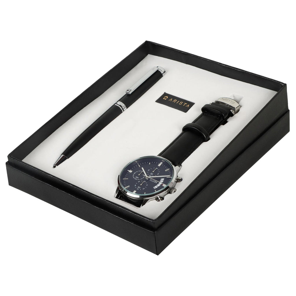 The Arista Switch Black CT Ballpoint Pen + Watch Gift Set is a distinguished gift set that seamlessly blends functionality with elegance. Designed for professionals and discerning individuals, this set offers a sophisticated writing experience complemented by a stylish timepiece. The Arista ballpoint pen features a Crafted with a Black body and chrome accents, the pen offers a luxurious feel and a comfortable writing experience. Equipped with an Easy Flow 9000 M refill made in Germany, ensuring smooth and consistent writing. The accompanying Elgin mens wristwatch features a sleek design with a chrome-tone finish, adding a touch of sophistication to any outfit. Presented in a premium gift box, this set makes an excellent choice for corporate gifts, special occasions, or personal use.