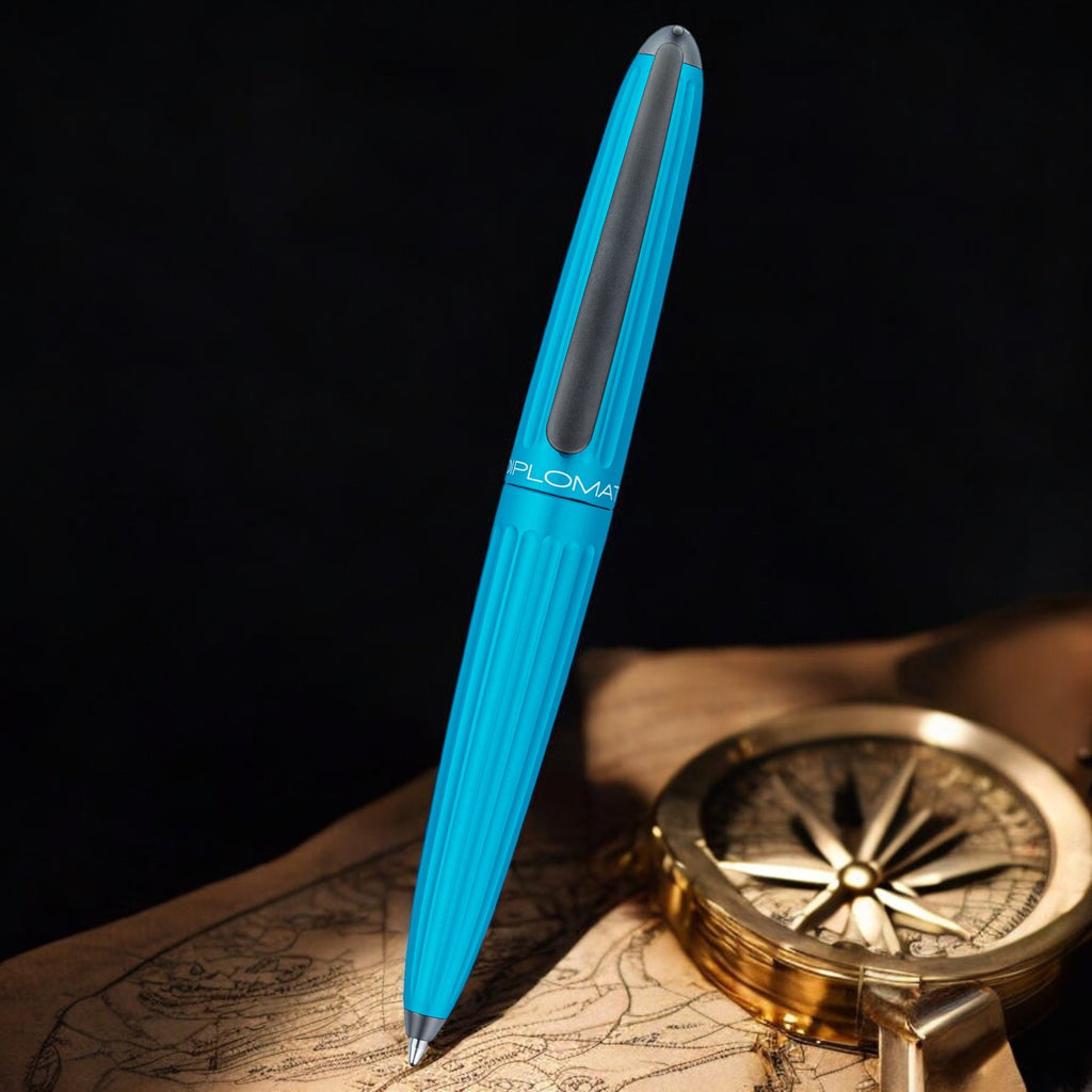 The Diplomat Aero Turquoise easyFlow Ball Pen is a high-quality writing instrument manufactured by Diplomat, a German brand known for its fine writing tools. In 1900 the Zeppelin airship began its first test flight under the aeronautical leadership of Earl von Zeppelin. Based on this event and the design of the airship Diplomat introduces the Aero pen to the market. The Diplomat Aero is characterized by groove-like depressions on the barrel which lends the pen next to its classic form a modern spirit. The Diplomat Aero is made of anodized aluminum and is especially designed ergonomically. The clip harmonises well with the shape of the Diplomat Aero. The AERO is available in a wide variety of metallic shades. In this way, the AERO can express every personality - a high-quality gift for every occasion. All Aero pens are presented in a luxury aluminium gift box.