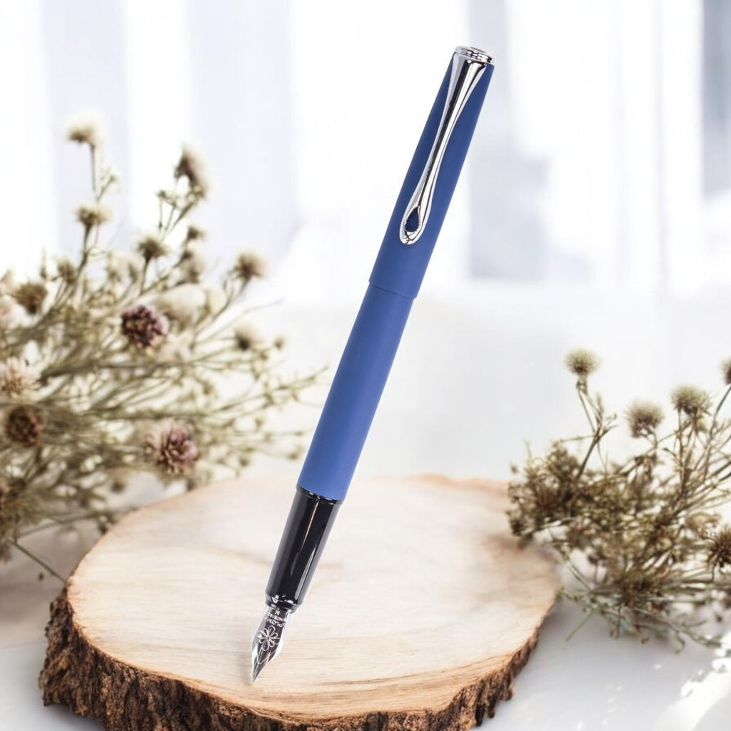 The Esteem range from Diplomat has been designed to represent elegance and status. These streamlined and classy pens are available in 4 different colour ways and finishes that are all complimented with polished chrome trims and the Diplomat logo on top of cap. With the Esteem range; Diplomat has created an affordable option that does not compromise on an excellent writing experience. The all-metal casing seen on all Diplomat ranges gives the Esteem a feeling of quality without being too heavy. Therefore this range will appeal to many people. We like the blueberry option with its satin-smooth coating and sophisticated colour. Diplomat Esteem Lapis Blue Fountain Pen comes fitted with our precision Stainless Steel Nib. You get an option to choose from Fine, Medium and Broad.