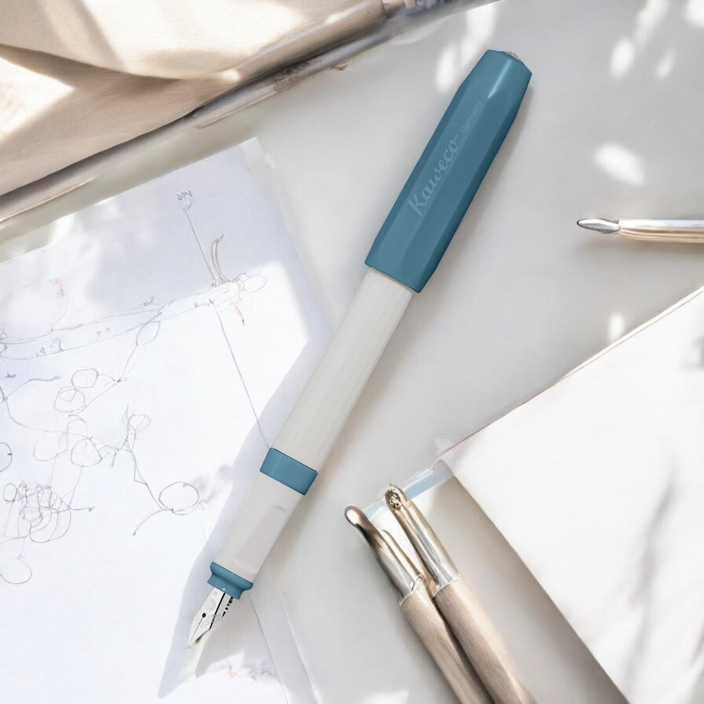 In Kaweco's history the PERKEO dip pen appears around 1900. The catalogue of the Heidelberg dip pen factory which was later named Kaweco, describes the PERKEO as a convertible fountain pen. Today PERKEO is designed to be an ink cartridge fountain pen and a convertible fountain pen. The design stems from the classic Kaweco tradition. The matt octagonal cap and the sixteen-edged barrel harmonize perfectly. The ergonomical grip section inures an effortless writing experience and the colors are very unique. Suitable for Long and Standard Sized Converters. With steel nib sizes F/M. The Perkeo is a new entry-level full-sized pen from Kaweco. The faceted body and grip are made of light grey resin, and the cap is made of blue resin. The triangular grip helps keep your fingers in the proper grip position.