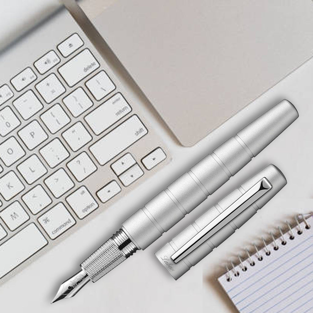 The Laban Solar fountain pen is modern, with a sturdy aluminum body. The well-proportioned Solar features concentric grooves machined onto the aluminum alloy body. Accented with polished chrome on the sculpted clip. The chrome gripping section is knurled for writing comfort and control. The Laban Solar fountain pen uses a stainless steel nib that is embossed with the Laban logo and uses a cartrdige/converter filling mechanism.