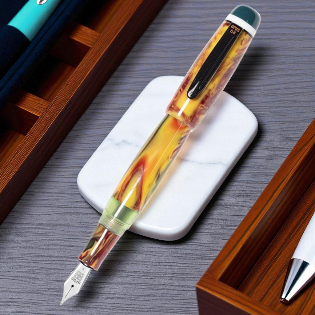 The Opus 88 Bela fountain pen is a large eyedropper-filled pen with a piston operated shut-off valve. The colored barrel of this pen is Green mixed with yellow and red resin that is reminiscent of a pond. The cap is made of the same individual resin with different shades of the colour the pen comes in. The pen features an piston knob, a black clip, and a silver stainless steel nib. It also comes with a glass eyedropper to fill the pen with your favorite ink. An ebonite piston and rubber gasket seals the feed off from the barrel when fully depressed, reducing the risk of leakage and burping. By unscrewing the blind cap and loosening the rod at the rear of the barrel, you open up the ink flow to the feed. During long writing sessions, leave the shut-off valve open to take advantage of the impressive ink capacity.