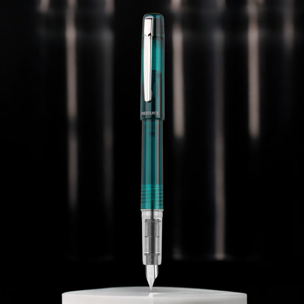 The Platinum Prefounte fountain pens come with a transparent resin body in subdued colors and a chrome plated spring steel clip. Desinged with a clear section to see the ink, an ABS feeder and a stainless steel nib. The cap contains a "Slip & Seal" mechanism to prevent ink from drying out in the pen with the cap on for a year. The Platinum Prefounte fountain pens are ideal for those who seek a smart and casual fountain pen and perfect for beginners. Platinum Prefounte Fountain Pen Dark Emerald is fitted with our precision Stainless Steel Nib. The package is blister packed with the pen, 1 cartridge and does not includes a converter.